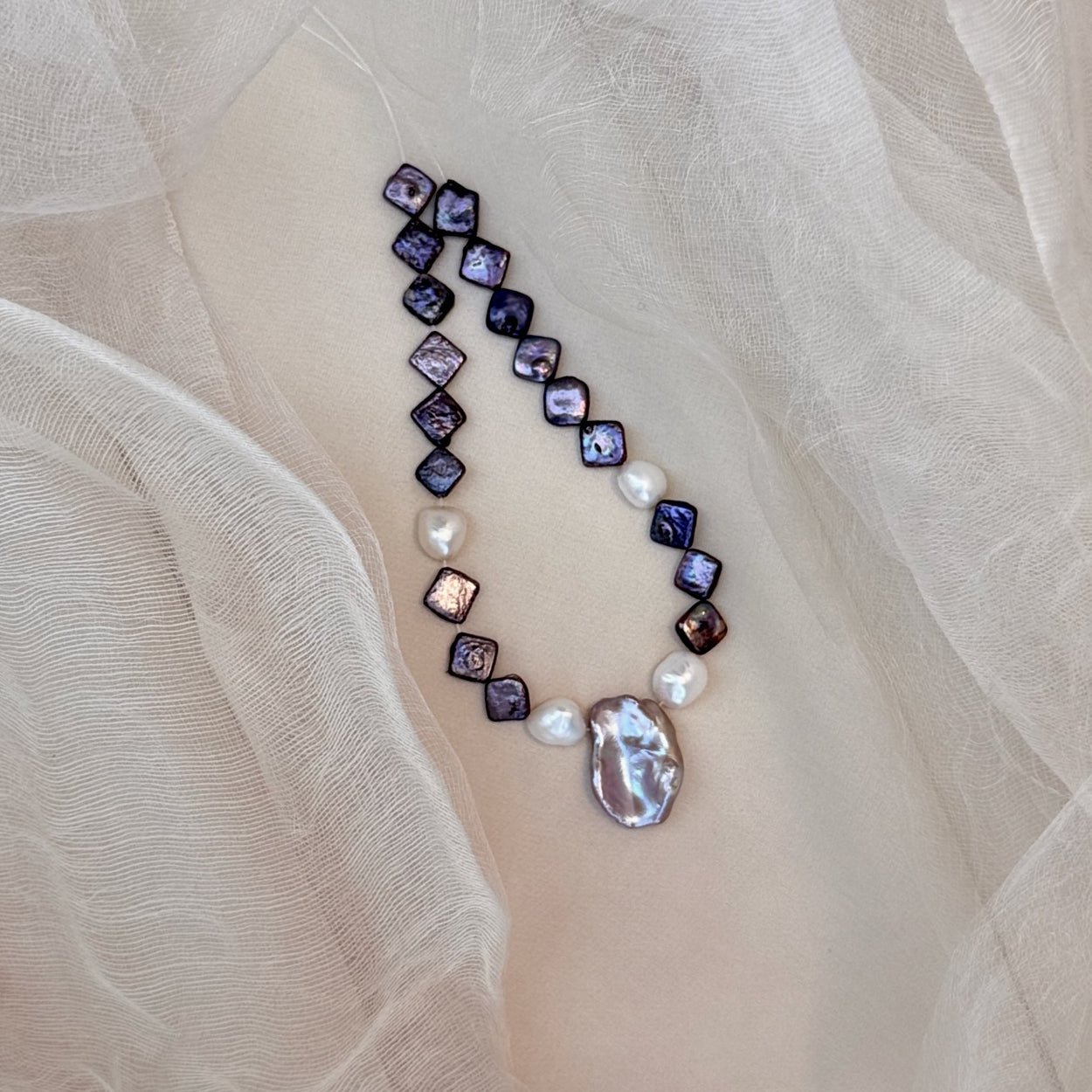 A dreamy blend of peacock square baroque freshwater pearls, glowing white baroque nugget pearls, and a delicate freshwater baroque seed nugget — each with its own story etched by nature. This necklace carries a touch of old-world charm and poetic whimsy, a one-of-a-kind favorite that feels both timeless and rare.