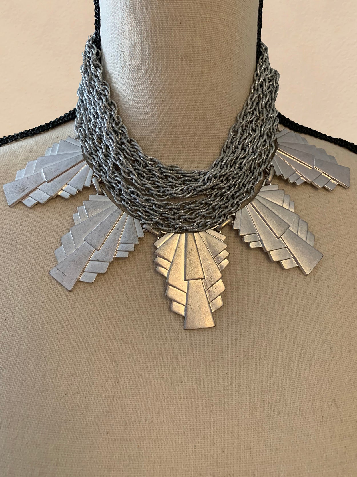 Sculpted with metropolis-inspired deco metallic pieces and wrapped around the neck with industrial, shimmering lightweight chains, the piece creates a sensual and modern necktie.