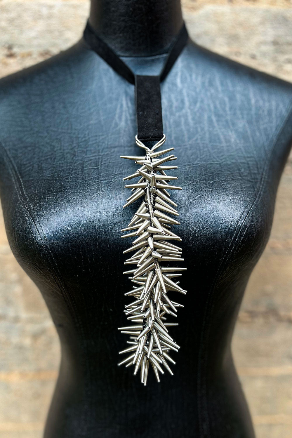 This cutting-edge gender-neutral necklace is embellished with numerous metallic cone pieces, crafting a statement-making and ultra-modern aesthetic. Beautifully tied around the neck with soft black suede, it adds a touch of sensuality to the design. Despite its intricate detailing, this piece maintains a lightweight construction for a comfortable and stylish wear throughout the day.