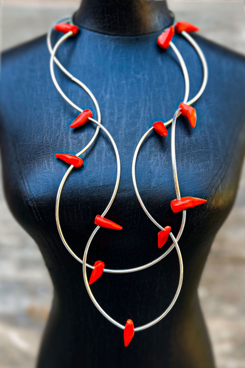 Featuring vibrant coral pieces in orange and red hues aligned with stainless steel loops, this necklace offers a striking and colorful accessory. Wear it as a long piece for a statement look or double it up for a layered style. Convenient for travel, it can be easily transported in its box. With a medium-weight design, it provides both style and comfort. Add a touch of bold sophistication to your outfit with this versatile and eye-catching piece.