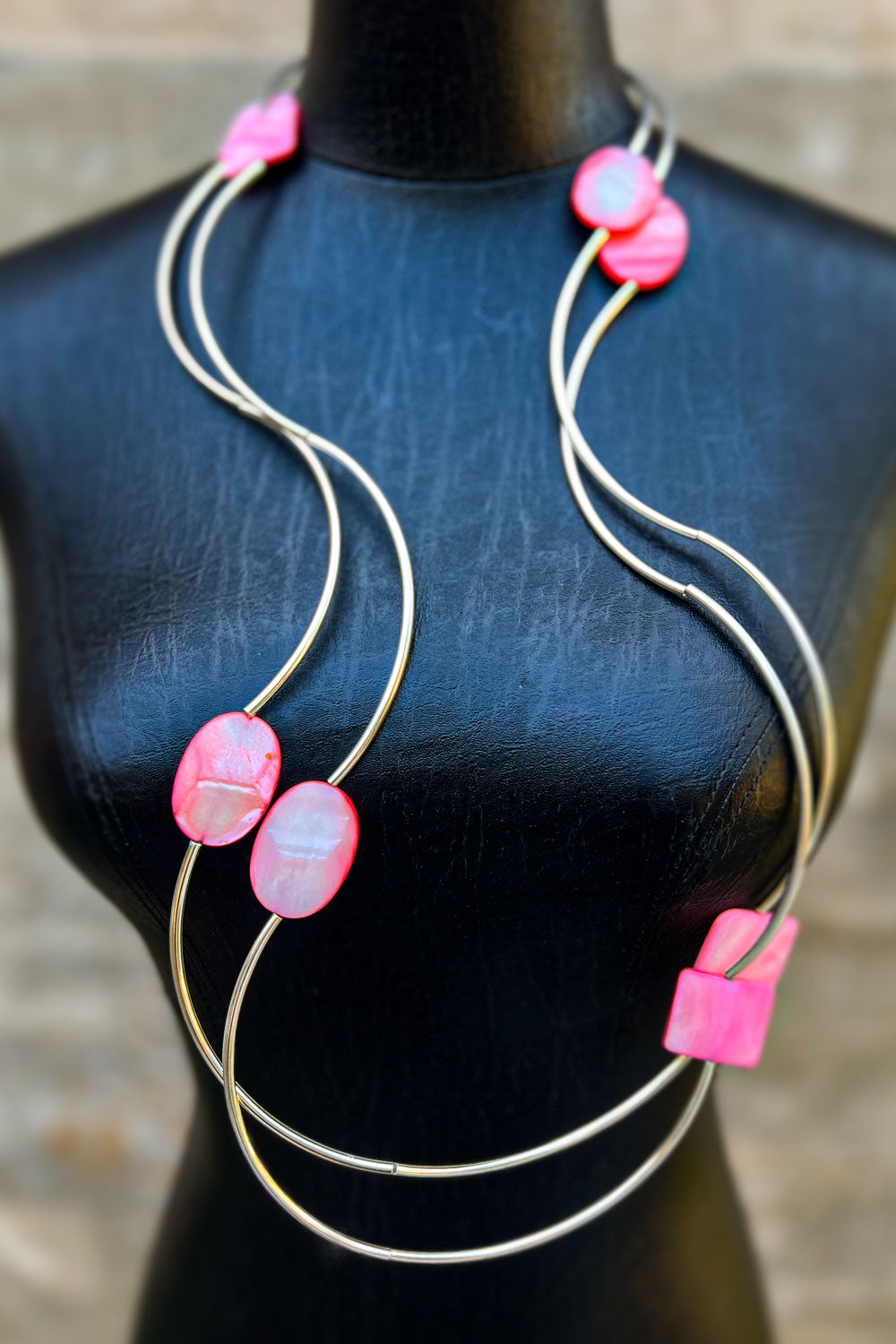 Adorned with delicate pink round and oval glass pieces accentuated by stainless steel loops, this gender-neutral necklace exudes a charming and elegant appeal. It is versatile and can be worn as a long single piece or doubled up for a layered look. Perfect for travel, it can be neatly packed in its box for convenience. Despite its intricate design, this accessory is lightweight, ensuring comfort all day long. Elevate your style with this  versatile piece that adds a touch of sophistication and whimsicality to your ensemble.