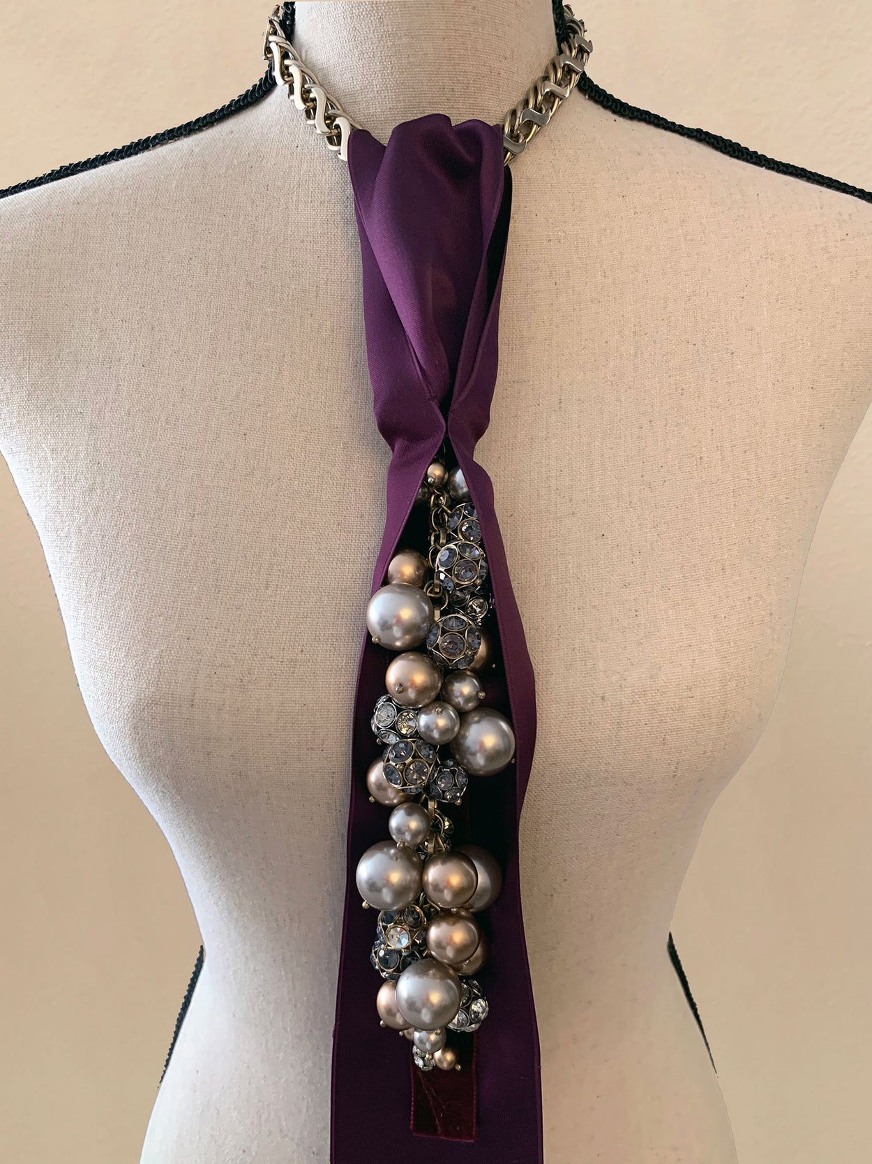 3 years ago I started working with vintage jewelry, interesting found metallic objects, period pieces and special beads. The concept is deconstructive/reconstructive, combining sculpting, couture and design. I have since created 150 vintage, medieval, industrial and futuristic Tie pieces.