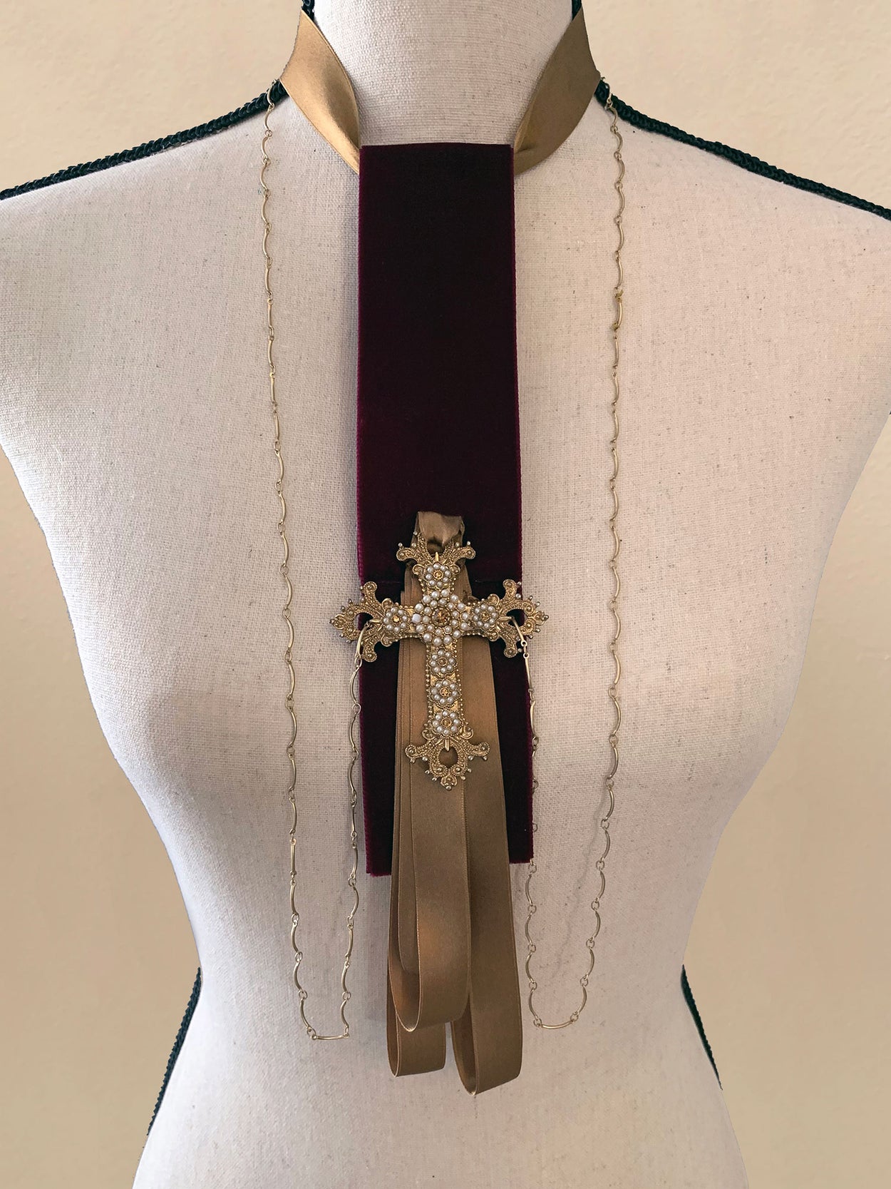 3 years ago I started working with vintage jewelry, interesting found metallic objects, period pieces and special beads. The concept is deconstructive/reconstructive, combining sculpting, couture and design. I have since created 150 vintage, medieval, industrial and futuristic Tie pieces.