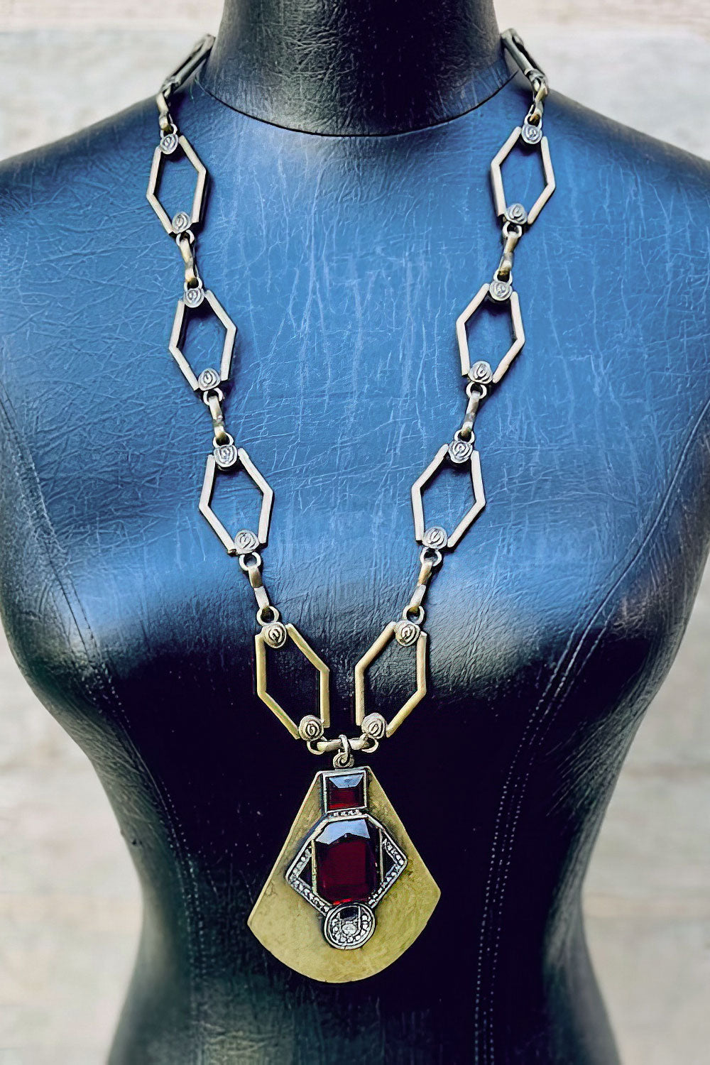 This unique custom jewel, blending elements of Gothic and classical European jewelry, paired with an unexpectedly perfect chain, forms a dramatic and gender-neutral necktie for a bold look. It can be worn with rich colors of a paisley fabric or paired with a sleek, stark and elegant monochromatic outfit.