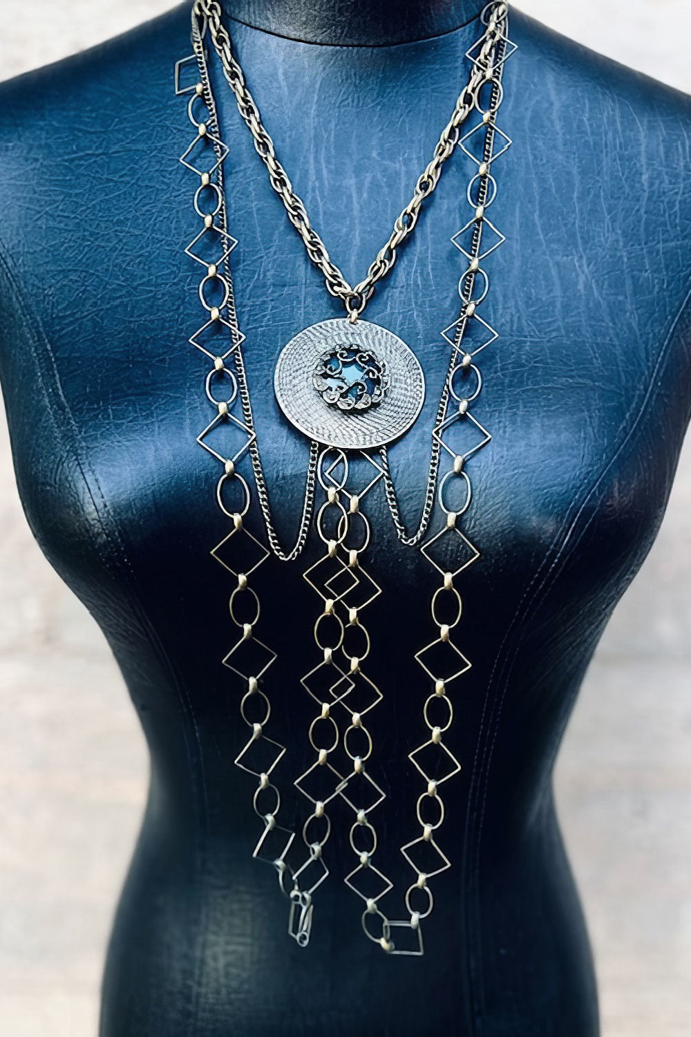 This necktie draws inspiration from Early European and Byzantine jewelry, constructed with multiple shaped chains and a central custom piece. Its design offers a soft, classic look suitable for both daytime and evening attire.