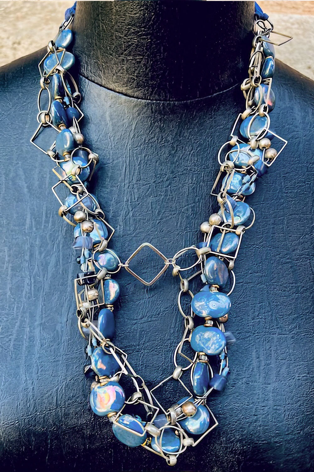 Combining these beautiful iridescent blue, pearl-like circular beads with deconstructed rectangular, post-modern chain elements, this necktie blends feminine and masculine, soft and hard aesthetics, creating a super modern look suitable for day and night wear.
