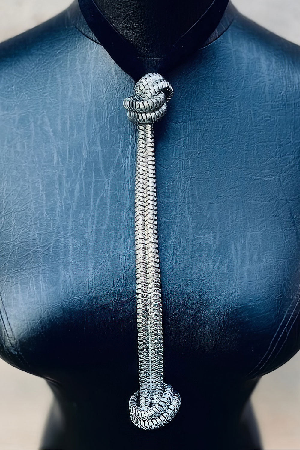 This densely woven, gender-neutral zip tie, wrapped around the neck with sensual black suede-like ribbons, is a super modern accessory perfect for pairing with a hip outfit or a sleek, minimalist look.It's designed for easy travel and comes neatly packed in its box. Despite its bold design, it's lightweight for comfortable daily wear.