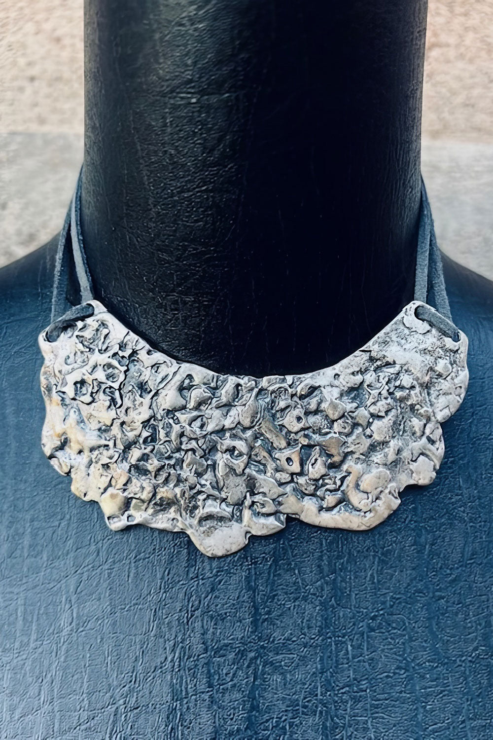 This solid sculpted metal piece creates a unique and striking look for modern attire.