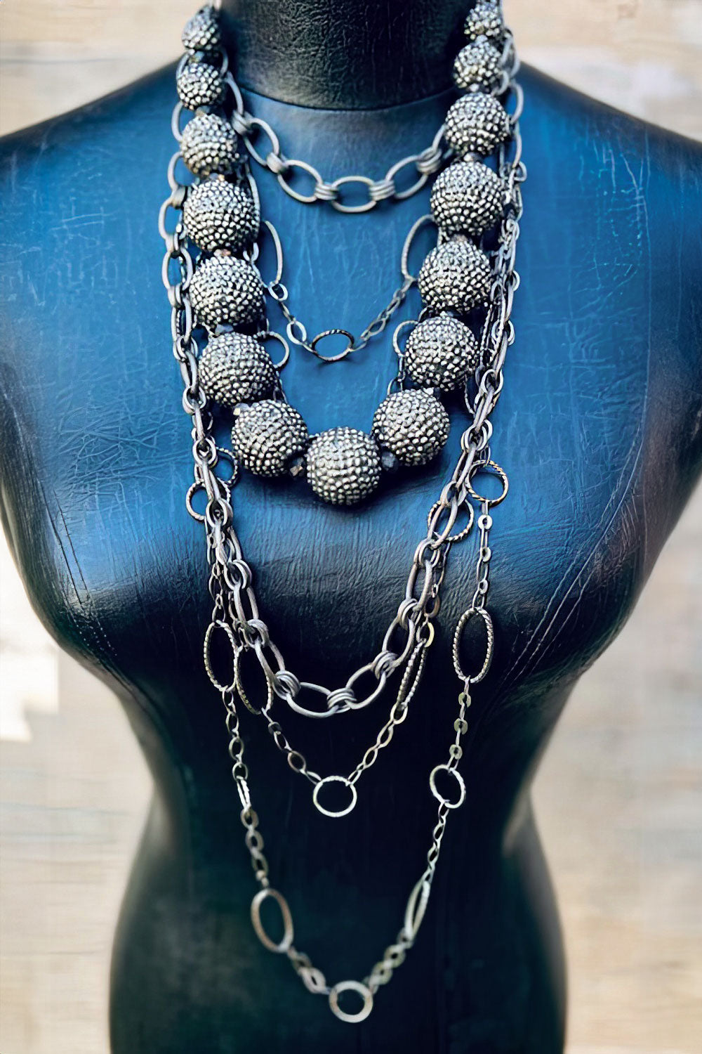 Sculpted with multiple dark grey vintage chains with shimmering black beads this neckltue creates a super modern and fun fusion. It's a great choice for an upbeat evening event. It's designed for easy travel and comes neatly packed in its box. Despite its bold design, it's medium weight for comfortable daily wear.