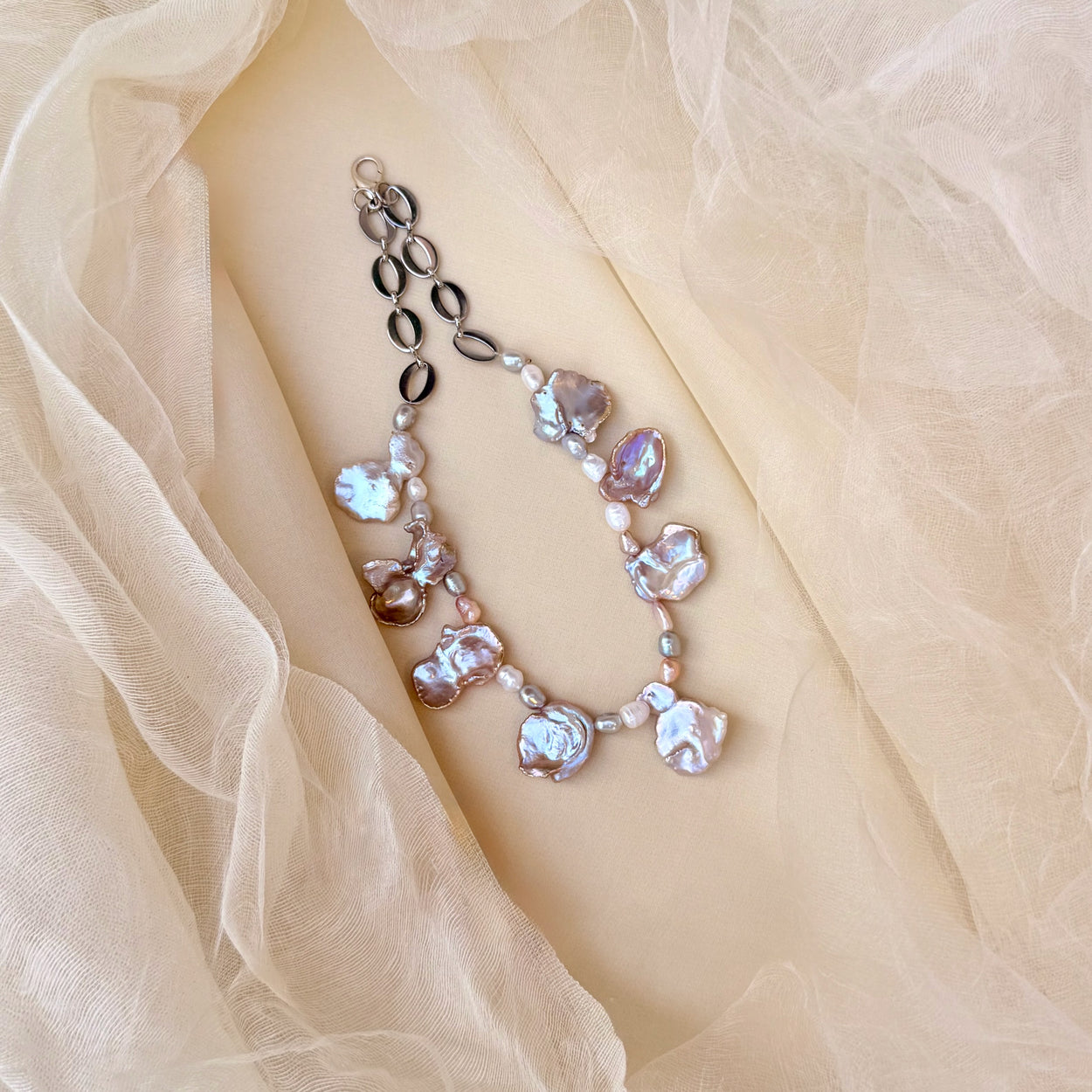 A captivating mix of rare long baroque Keshi pearls, high-luster white baroque, and natural pearls in soft champagne, peach, light green, and white tones. Each piece is a one-of-a-kind creation, sculpted by nature’s own hand through a mesmerizing organic process. Strung on an intricate white gold–plated chain that preserves its luminous shine and subtle silver patina, this necklace is a true heirloom of enduring elegance.