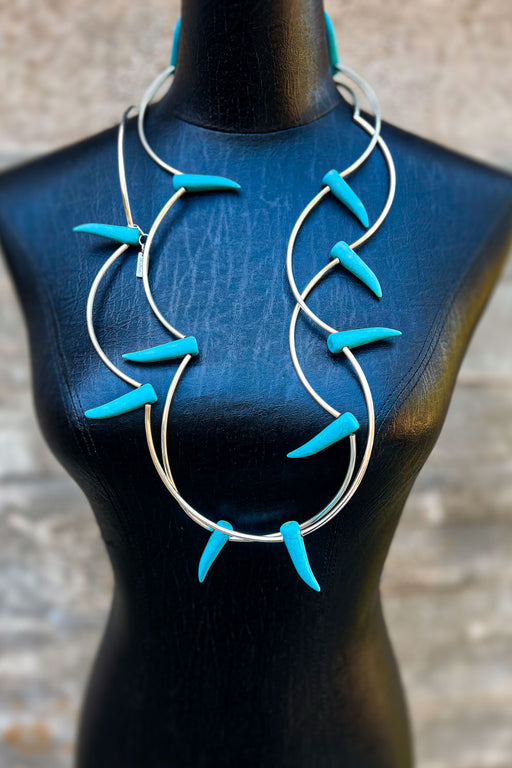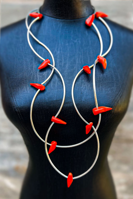 Each piece was created with no specific formula and pre-fabricated pattern in mind. They are re-constructions of my collected pieces and objects to sculpt my Ties designs. They are handmade and one of a kind. Most fabrics are 100% silk unless for stabling the pieces. I work with a brilliant team and am grateful to them for their openness to working with me on mounting and the assemblage of the pieces.