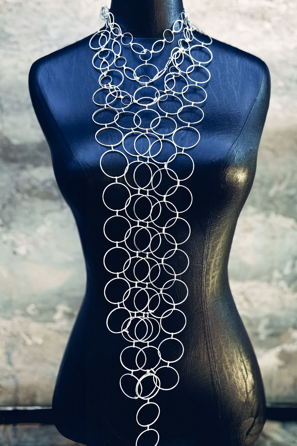 Sculpted from stainless steel loops, this cutting-edge, gender-neutral necktie exudes a sleek, ultra-modern aesthetic. Despite its robust material, it maintains a lightweight and comfortable design. Crafted for travel convenience, it is packaged in a compact and easily portable box.