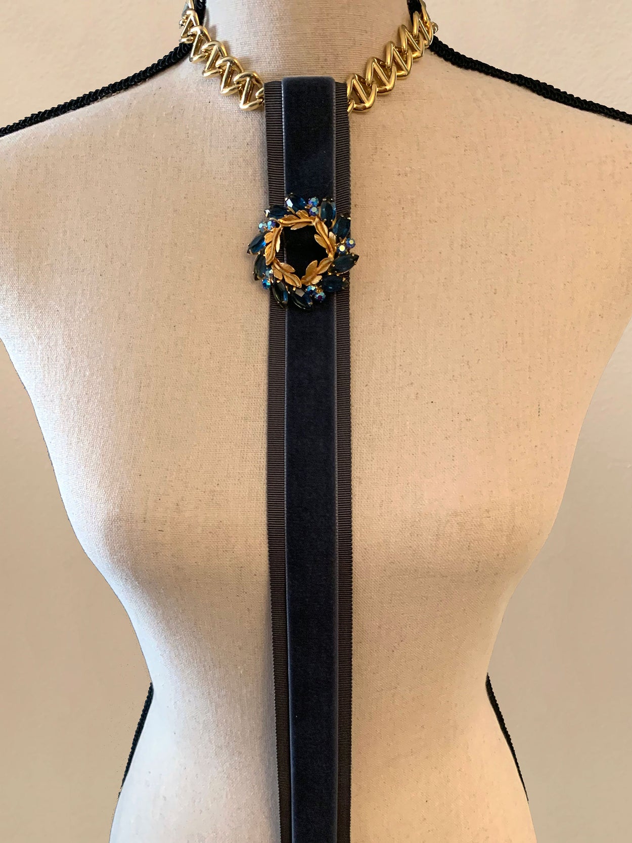 3 years ago I started working with vintage jewelry, interesting found metallic objects, period pieces and special beads. The concept is deconstructive/reconstructive, combining sculpting, couture and design. I have since created 150 vintage, medieval, industrial and futuristic Tie pieces.