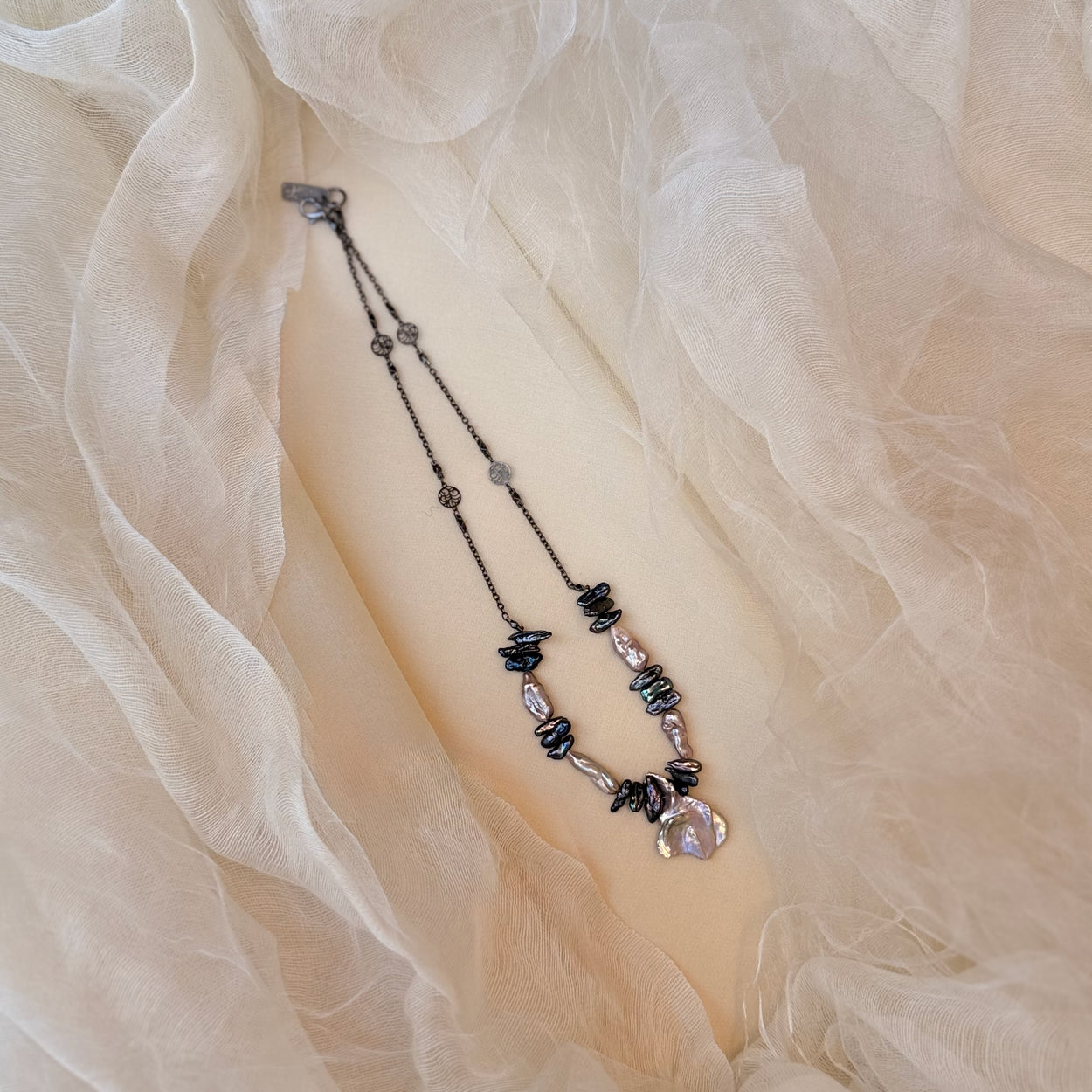 Crafted with very rare, high-luster black Keshi freshwater pearl beads, high-quality baroque seed nugget Keshi pearls, and iridescent natural light purple and rose Biwa stick pearls, this piece is a radiant celebration of texture, rarity, and organic beauty.